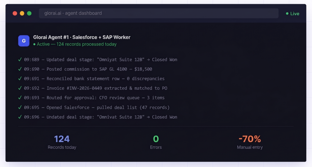 Glorai deploys autonomous AI web agents that handle CRM updates, ERP entries, invoice processing, and financial reconciliation — continuously, without errors, 24/7.